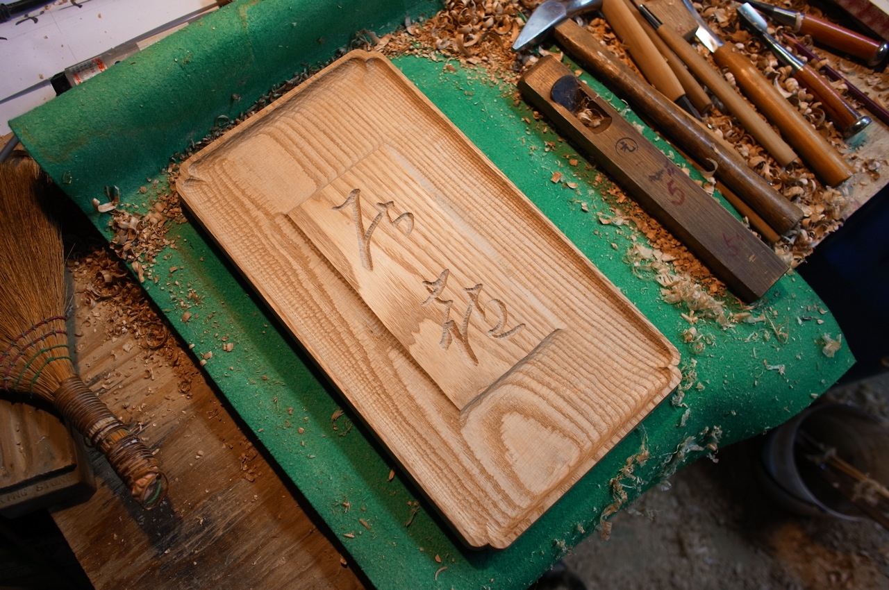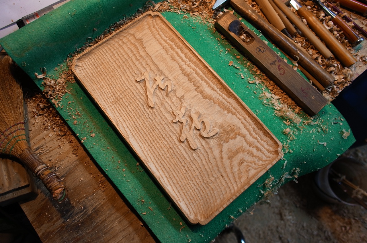 居七十七の看板を木彫りで制作。